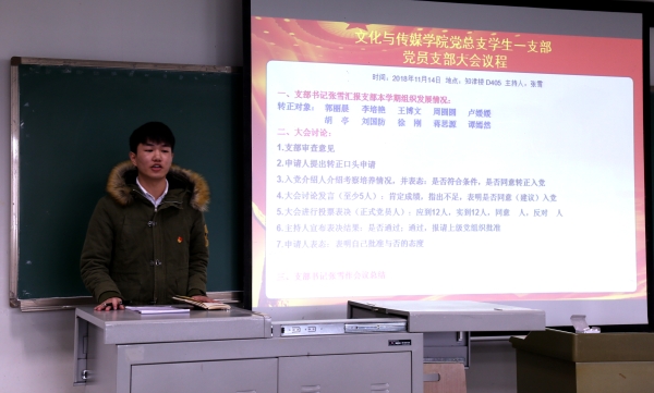 2018年11月14日上午,文化与传媒学院党总支学生一支部2018年下半年预备党员转正大会在知津楼D405顺利召开,文化与传媒学院党总支书记白成良、学生一支部全体党员、预备党员、发展对象和转正同志的入党介绍人参加了此次会议,本次会议由支部书记张雪主持。