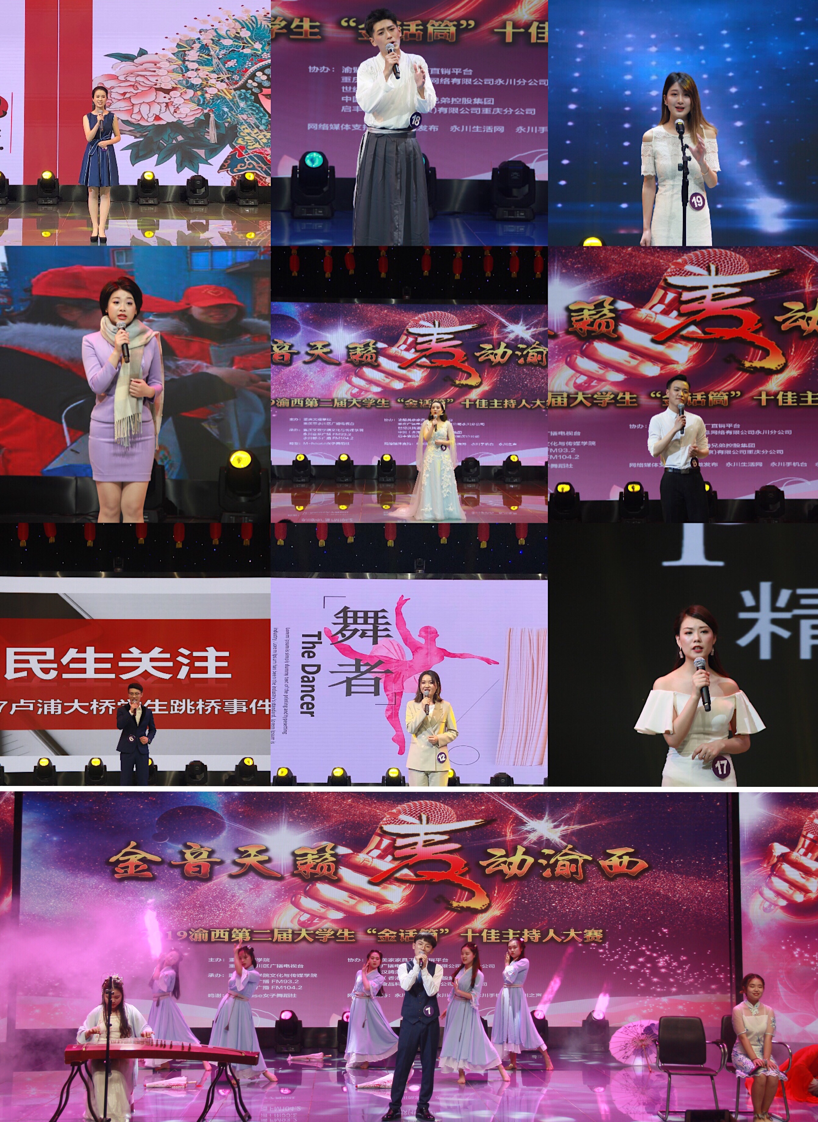 比赛现场进行全球直播,共分为风采展示、个性主持、才艺展示和话题评述四个环节。风采展示,来自渝西片区高校的20名选手依次在聚光灯下展现自我;个性主持,话题涵盖民生服务、文化、新闻评论等多个方面;才艺展示,选手多才多艺惊艳全场;话题评述,三位晋级选手展开了一场别开生面的即兴主持。经过四轮对决,重庆人文科技学院杨阳,PA官网易芳、我校教育学院王虹懿分别获得“铂金话筒”、“金话筒”、“银话筒”称号;PA官网谭寅卓、刘璐,重庆人文科技学院方梦玲等同学获得“十佳主持人”称号;重庆交通大学张婧、重庆大学城市科技学院周彦宏、重庆师范大学涉外商贸学院邓世渝、重庆水利电力职业技术学院于忠秋、重庆城市职业学院唐一航、重庆传媒职业学院熊显兰等同学获得“优秀主持人”称号;重庆财经学院罗喜月获得“最佳上镜奖”;重庆工程学院潘春全获得“最佳人气奖”。