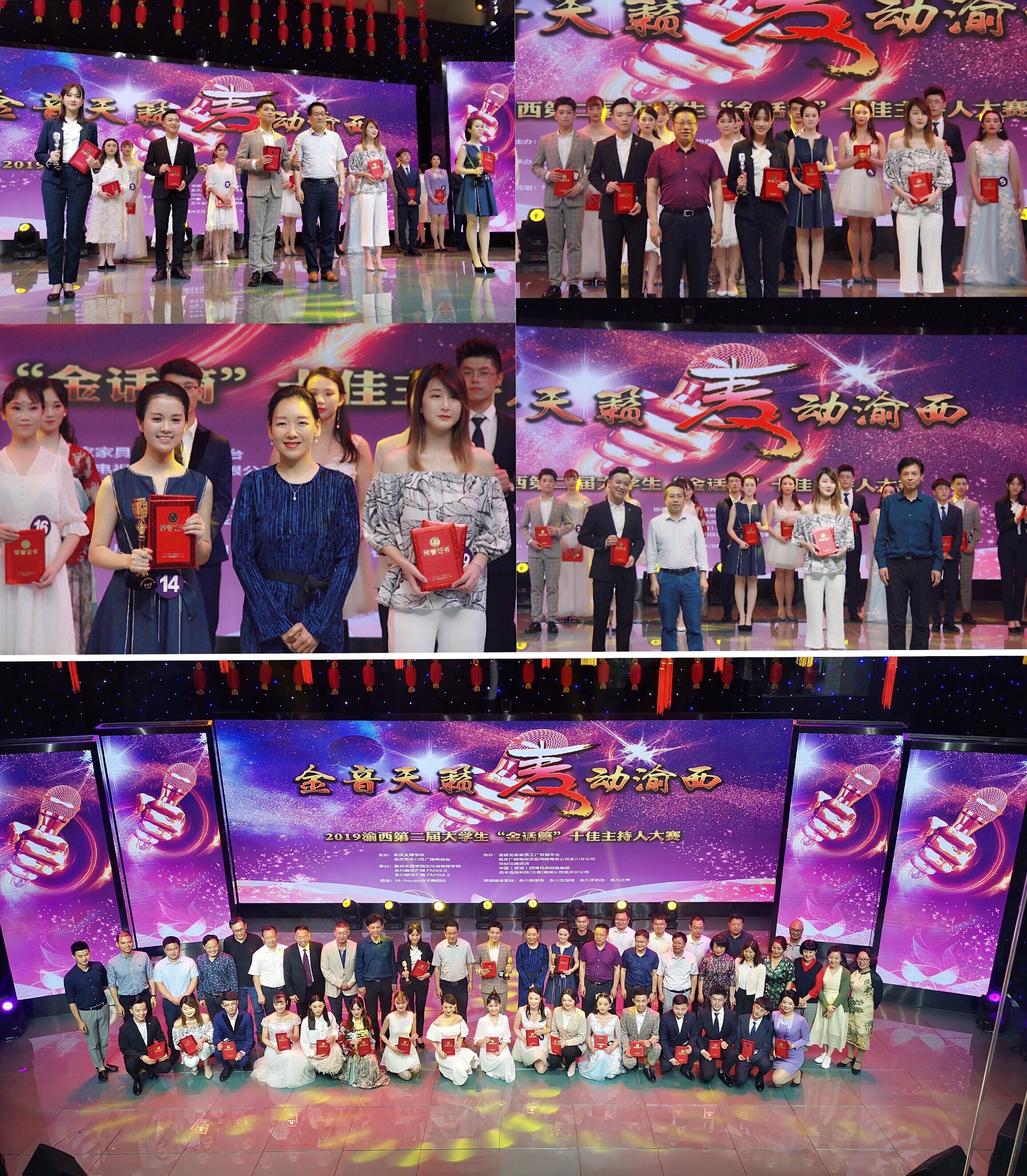 比赛现场进行全球直播,共分为风采展示、个性主持、才艺展示和话题评述四个环节。风采展示,来自渝西片区高校的20名选手依次在聚光灯下展现自我;个性主持,话题涵盖民生服务、文化、新闻评论等多个方面;才艺展示,选手多才多艺惊艳全场;话题评述,三位晋级选手展开了一场别开生面的即兴主持。经过四轮对决,重庆人文科技学院杨阳,PA官网易芳、我校教育学院王虹懿分别获得“铂金话筒”、“金话筒”、“银话筒”称号;PA官网谭寅卓、刘璐,重庆人文科技学院方梦玲等同学获得“十佳主持人”称号;重庆交通大学张婧、重庆大学城市科技学院周彦宏、重庆师范大学涉外商贸学院邓世渝、重庆水利电力职业技术学院于忠秋、重庆城市职业学院唐一航、重庆传媒职业学院熊显兰等同学获得“优秀主持人”称号;重庆财经学院罗喜月获得“最佳上镜奖”;重庆工程学院潘春全获得“最佳人气奖”。