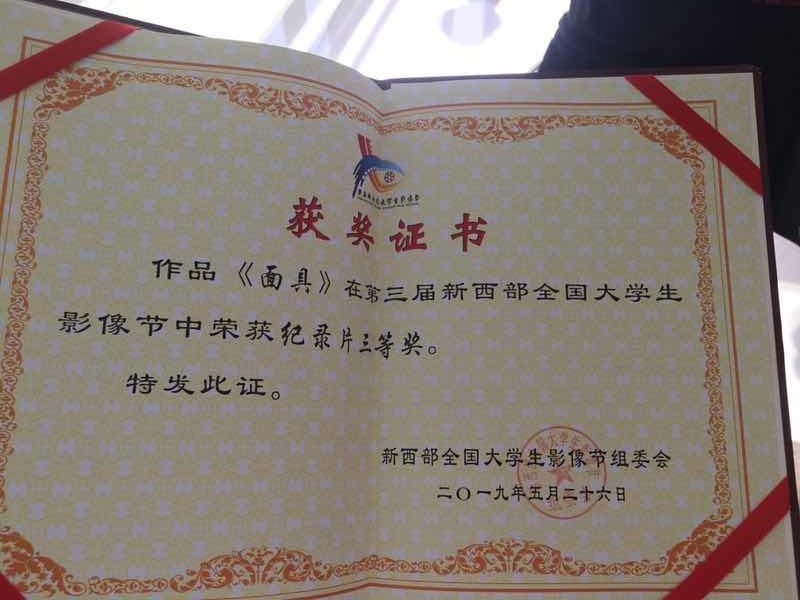 5月26日下午,第三届新西部全国大学生影像节颁奖盛典在西北大学现代学院隆重举行,PA官网2015级广播电视编导专业刘爽、汪施羽创作的纪录片《面具》(指导老师:陈怡冰)获得纪录片单元三等奖。