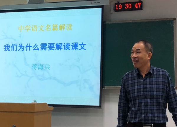 10月17日晚,来自永川区北山中学的蒋海兵老师于知津楼D305为2018级汉语言文学师范学生带来了一次关于语文教师课文解读的课堂教学。