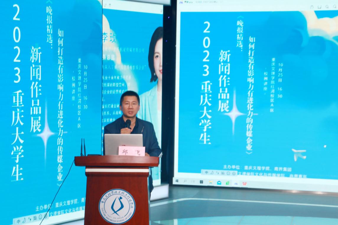 邱飞首先致欢迎词,然后介绍了李玫的重要业绩及经历,讲述了本次讲座的背景意义,引导传媒学子要跳出传统的专业思维,从经济等新角度去认识传媒行业。强调,从经济方面和创新创意方面来理解传媒是一个新颖的角度,发展创新思维、创新能力,这也顺应了时代和行业的发展。同时,学生应从多角度认识世界,从多角度挖掘自己的潜能,找准自己的定位。他表示,由我校和商界集团共同开展的重庆大学生新闻作品展大赛获得了重庆多所高校的大力支持,各校学生参赛活跃度高。希望能通过与商界集团联合举办重庆大学生新闻作品展评选活动提高同学们对主流媒体的认知,培养同学们新闻采写等多方面的能力。